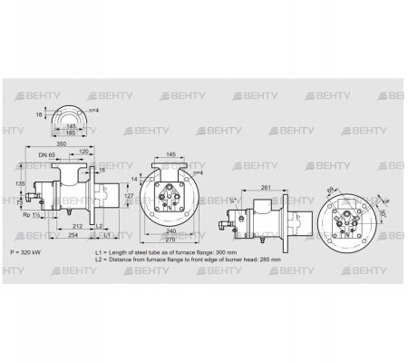 Расстояние от фланца топки до передней кромки головки горелки: 285 мм.