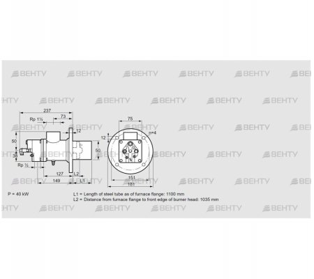 Расстояние от фланца топки до передней кромки головки горелки: 1035 мм.